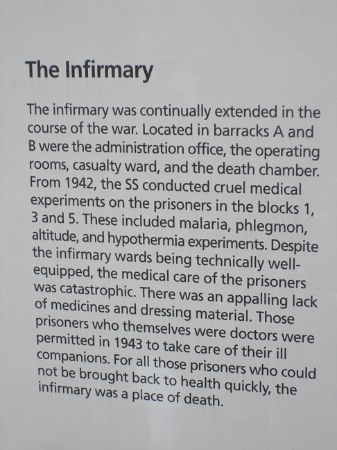 infirminfo Some of the barracks were used for the infamous medical experiments on the prisoners. As researchers we wanted to know more about the experimentation which later led the path for the ethical guidelines set out in the Nuremberg Code -- but interest subsequently gave way to discomfort (to say the least) as we learned of hypothermia-induction, pus injections, and non- pressure-limited altitude tests. |